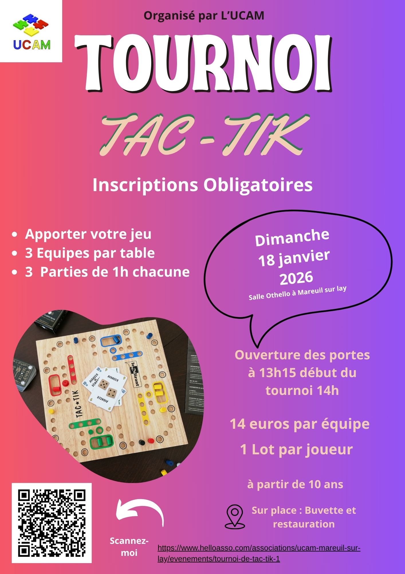Inscriptions obligatoires sur Helloasso.com/associations/ucam-mareuil-sur-lay/evenements/tournoi-de-tac-tik-1 - à partir de 10 ans